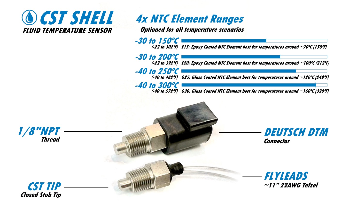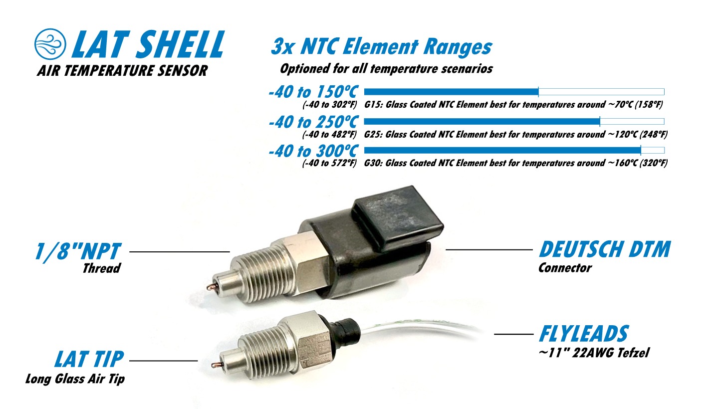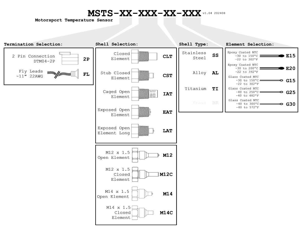 2Pin DTM Connector, M14x1.5, Alloy Open Shell, Glass Element GM OEM IAT Calibration -30 to 150degC (-22 to 302degF) MSTS-2P-M14-AL-G25 2Pin DTM Connector, M14x1.5, Alloy Open Shell, Glass Element -40 to 250degC (-40 to 482degF) MSTS-2P-M14-AL-G30 2Pin DTM Connector, M14x1.5, Alloy Open Shell, Glass Element -40 to 300degC (-40 to 572degF) |
