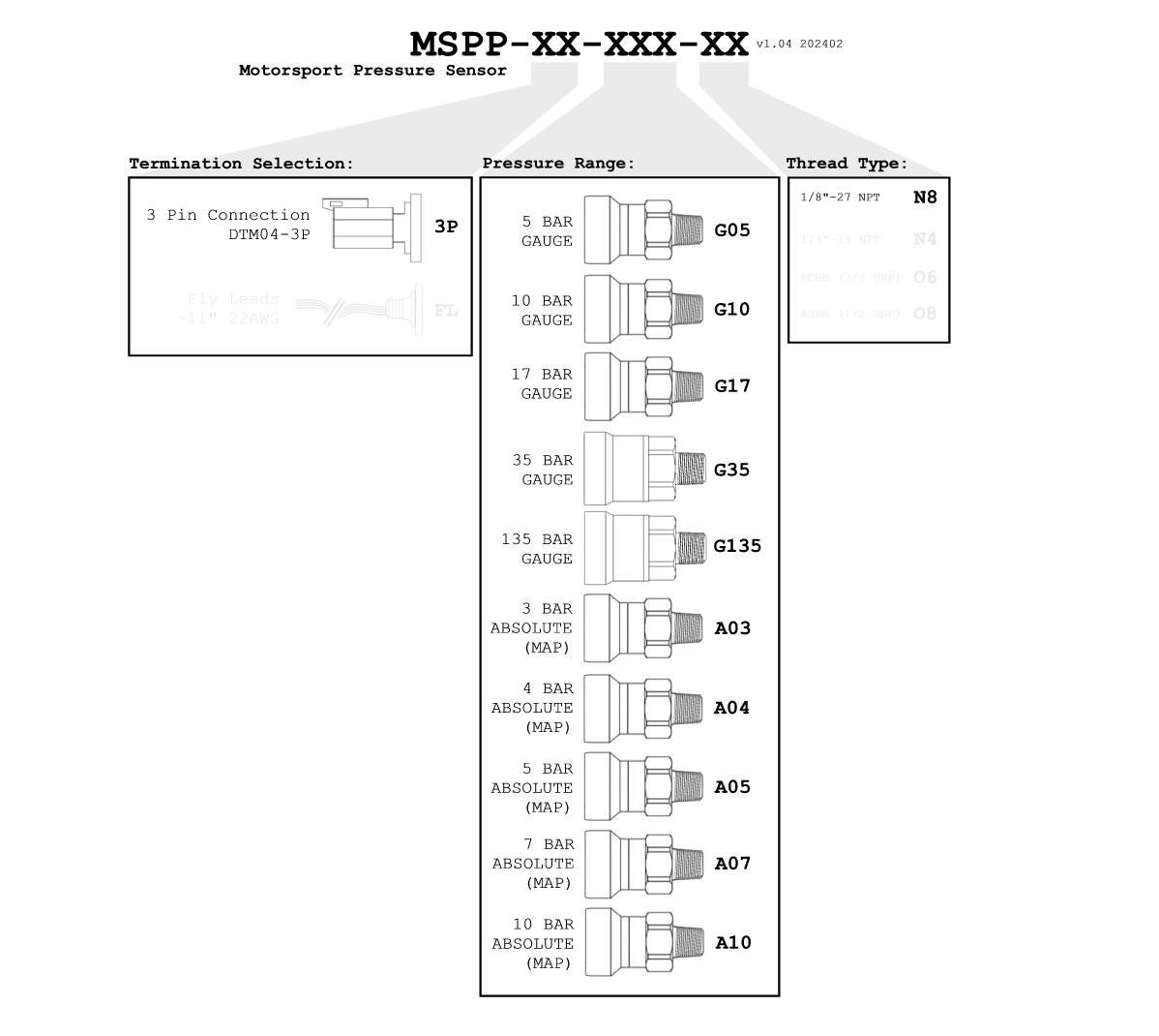 3Pin DTM Connector, 1/8"NPT, 3BAR MAP / ABSOLUTE PRESSURE MSPP-3P-A04-N8 3Pin DTM Connector, 1/8"NPT, 4BAR MAP / ABSOLUTE PRESSURE MSPP-3P-A05-N8 3Pin DTM Connector, 1/8"NPT, 5BAR MAP / ABSOLUTE PRESSURE MSPP-3P-A07-N8 3Pin DTM Connector, 1/8"NPT, 7BAR MAP / ABSOLUTE PRESSURE MSPP-3P-A10-N8 3Pin DTM Connector, 1/8"NPT, 10BAR MAP / ABSOLUTE PRESSURE MSPP-3P-G05-N8 3Pin DTM Connector, 1/8"NPT, 5BAR GAUGE PRESSURE MSPP-3P-G10-N8 3Pin DTM Connector, 1/8"NPT, 10BAR GAUGE PRESSURE MSPP-3P-G17-N8 3Pin DTM Connector, 1/8"NPT, 17BAR GAUGE PRESSURE |